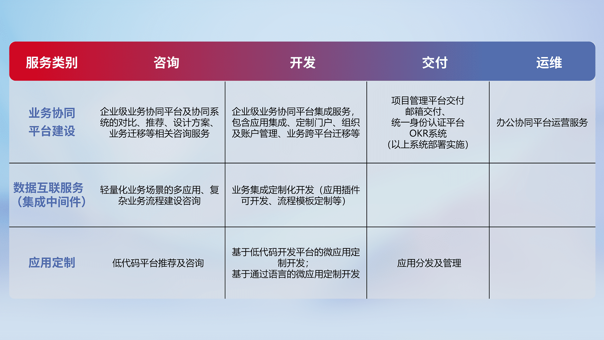 针对钉钉、、、企微、、、IDaas等平台级产品提供产品的规划、、方案、、、交付、、、、定制化开发等服务,,,实现如统一协同办公、、智能客户服务、、、混合会议管理、、智能数据查询、、等业务场景,,,实现数字化转型。。。
